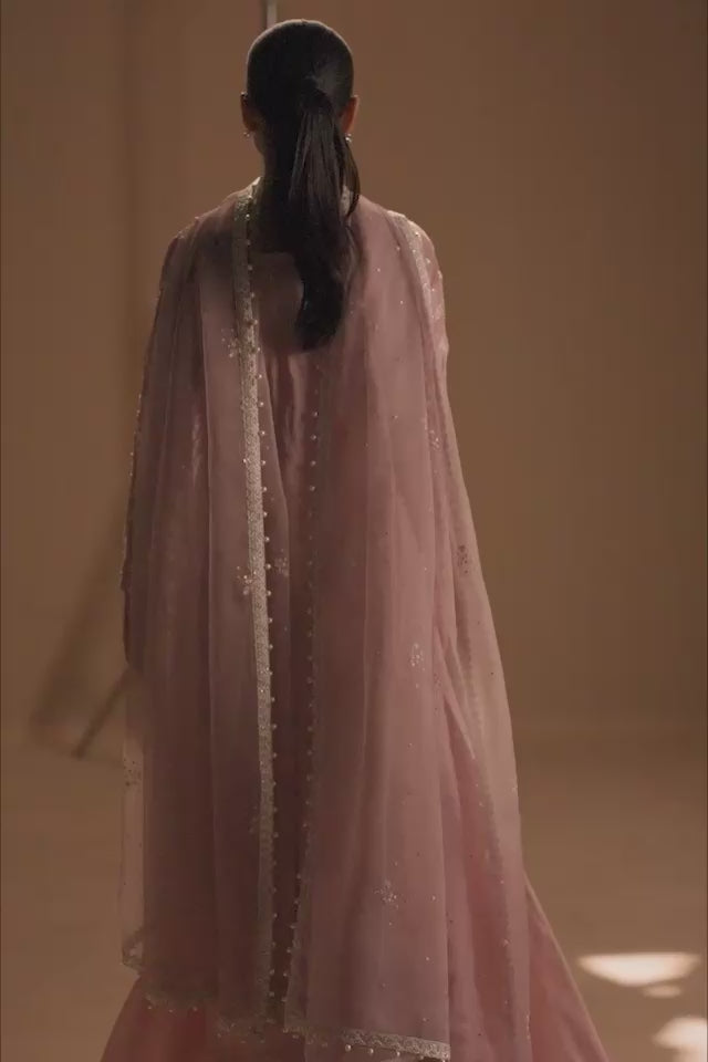 A delicately embroidered silk shirt with lace-edged sides, paired with silk katan sharara pants. Completed with an embroidered dupatta, accented with lace, pearl edging, and sequin embellishments.