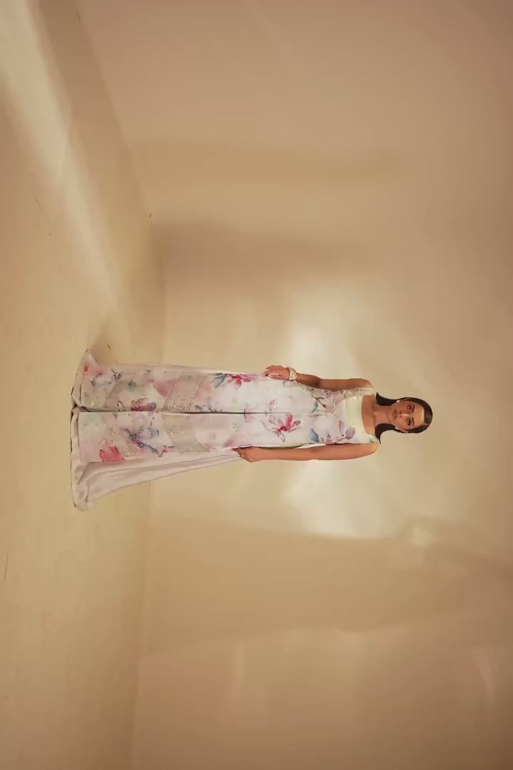 Light Blue front-open shirt with a blend of abstract floral print, hand- embellished with sequins, crystals, and pearls. Paired with light blue camisole and flared pants. The look is completed with an organza dupatta, delicately adorned with sequin spray and finished with a geometric border.