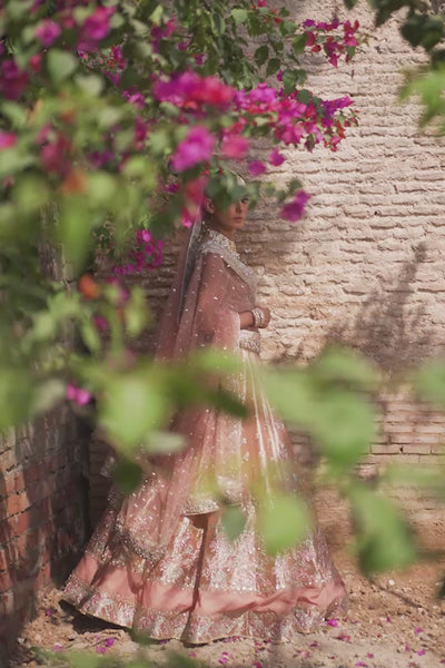 A coral tissue lehenga featuring embroidered borders with intricate zardozi detailing. It is paired with a corseted blouse adorned with thread embroidery and zardozi work. The pink net dupatta has embroidered embellished borders and is finished with a crystal and sequins.