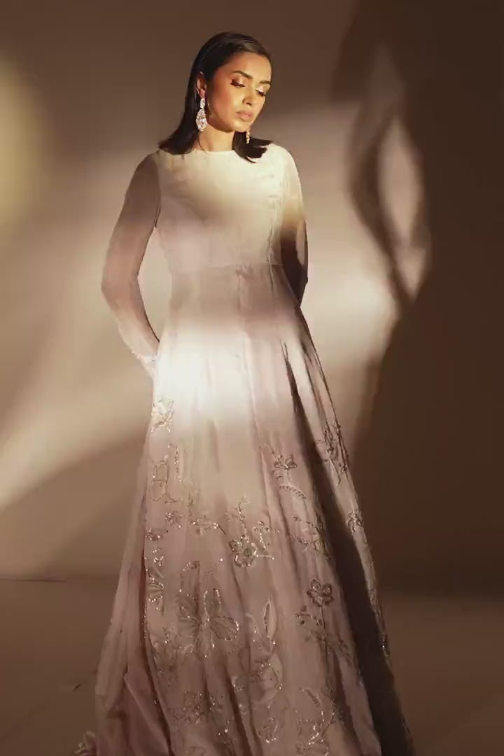 Tissue silk gown with a heavy floral pattern on the hem, hand-embellished with sequins, pearls, and zardozi. The ensemble is completed with a printed dupatta adorned with sequins, pearls, and finished elegantly with lace detailing.