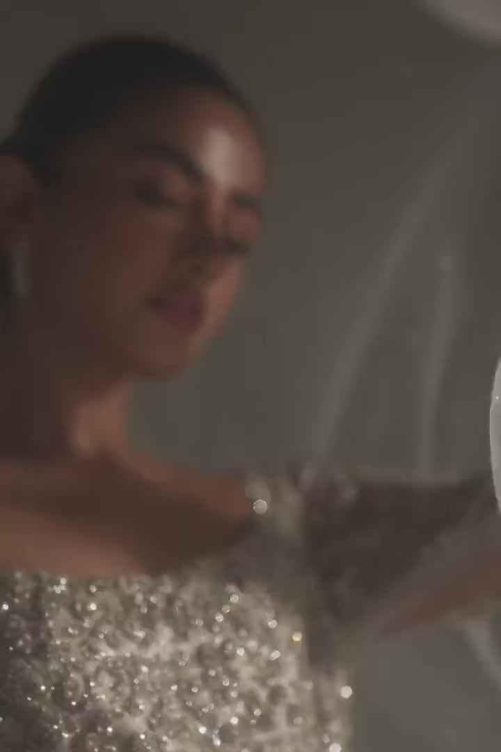 A full-length gown made of net, which is heavily embellished with zardozi, sequins, and crystal work. It features a bridal gown with a mermaid fit and train. This design is paired with a cathedral-style veil with a light border, along with heavy crystals and pearl spray in the middle.